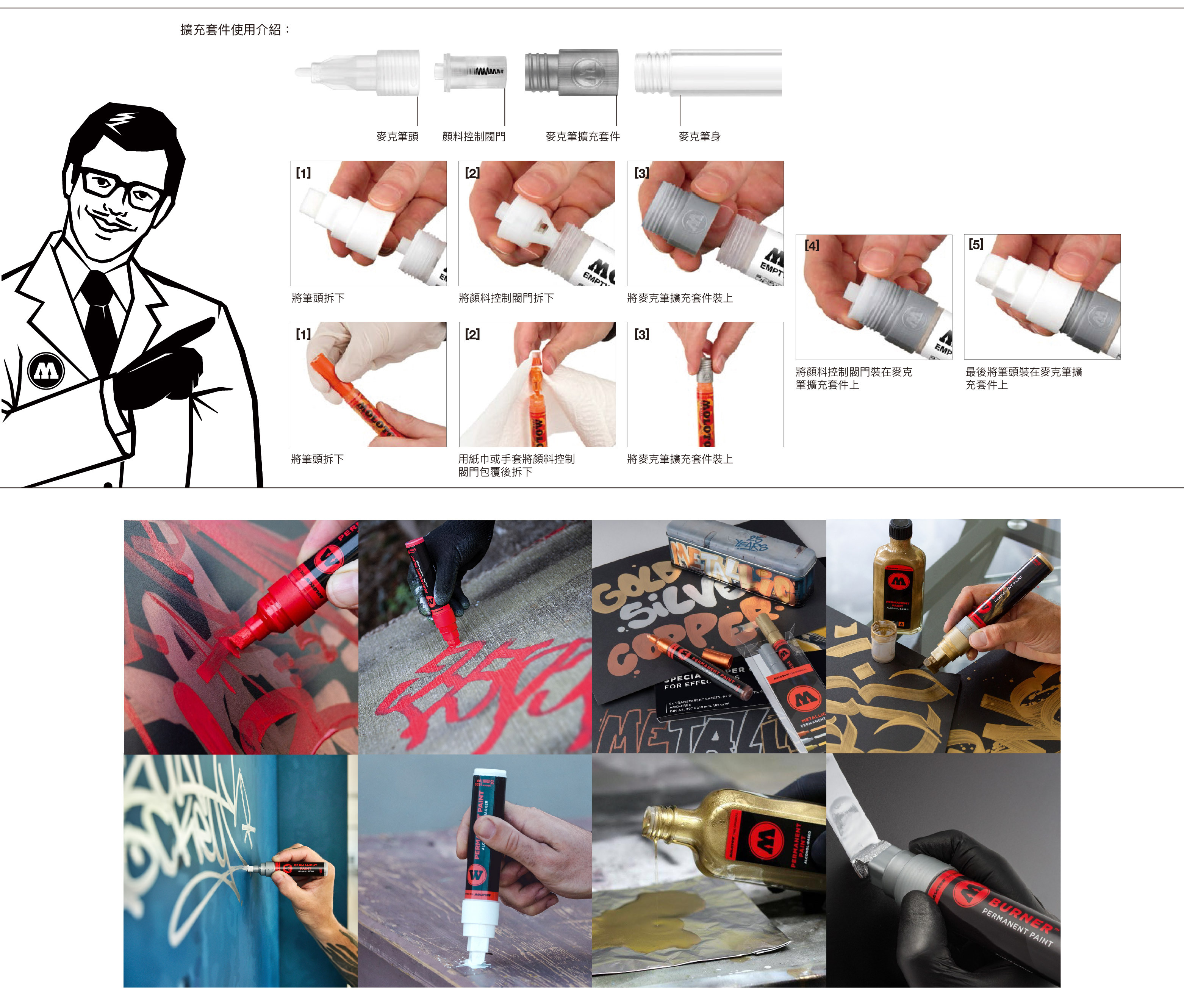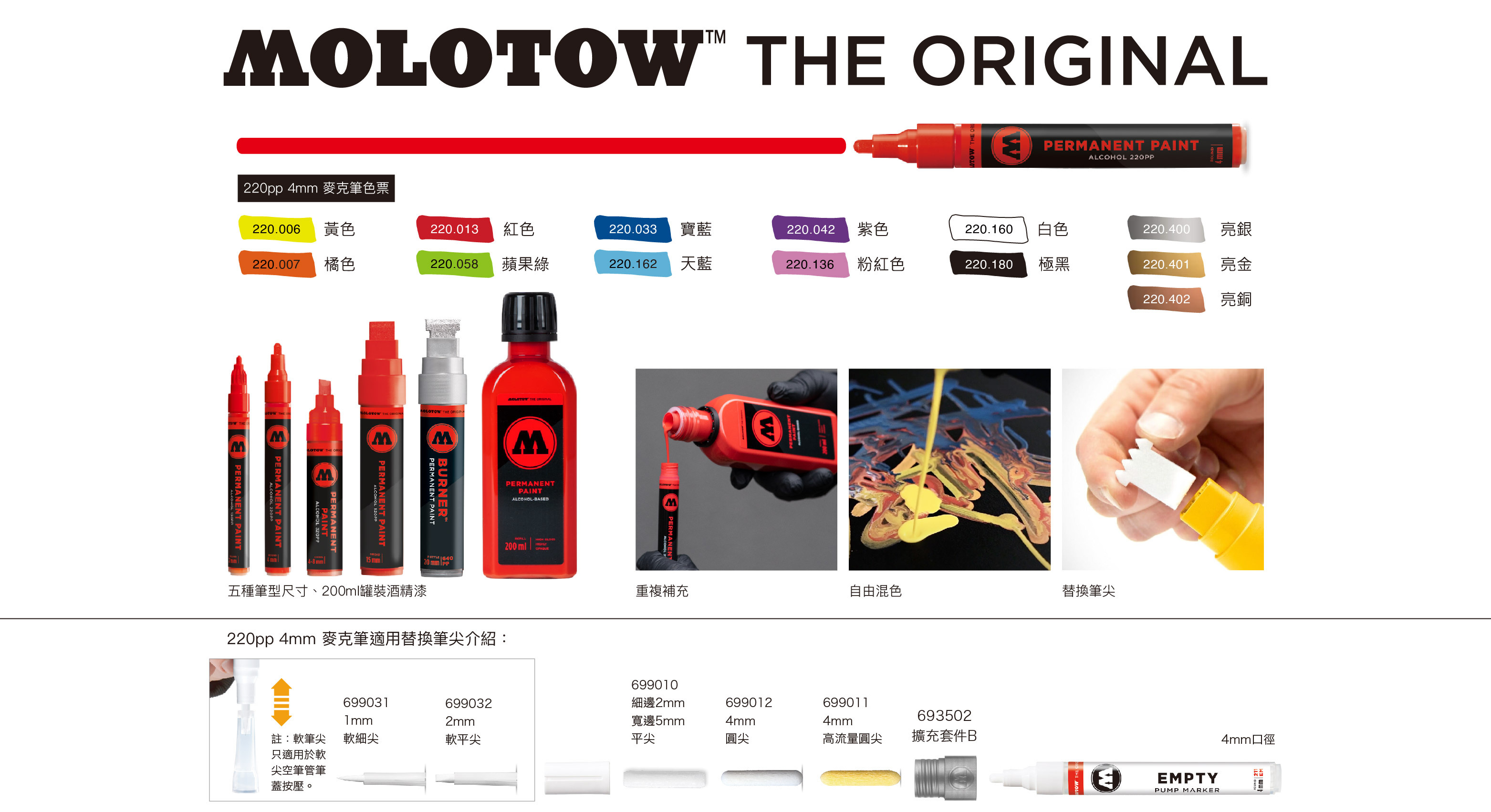 擁有五種賣筆尺寸、三種滴流筆尺寸可供選擇,永恆酒精漆麥克筆是可以重新補充、替換筆尖也能乾淨的完成創作,除此之外創作者也可以混合自己想要的顏色,總共有十三個顏色基底可供選擇。