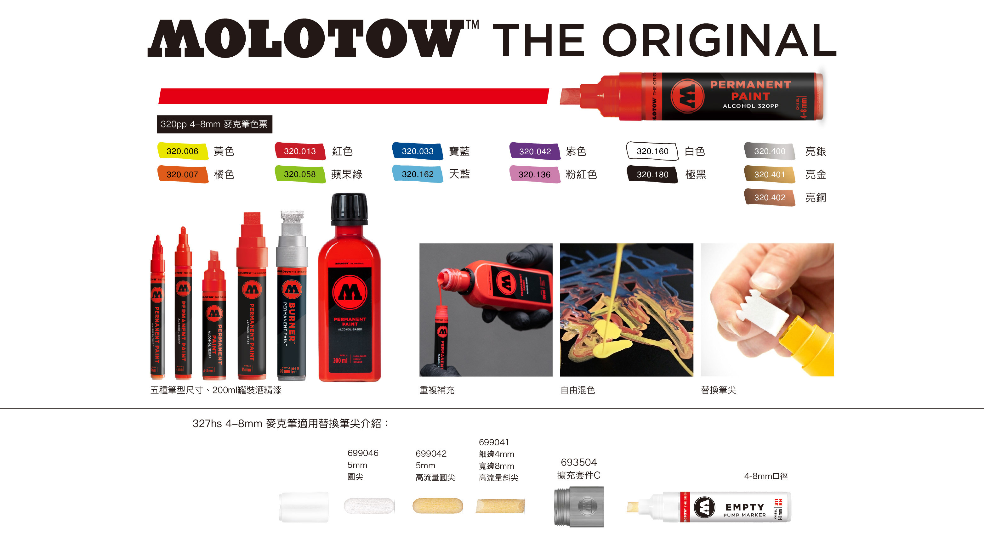 擁有五種賣筆尺寸、三種滴流筆尺寸可供選擇,永恆酒精漆麥克筆是可以重新補充、替換筆尖也能乾淨的完成創作,除此之外創作者也可以混合自己想要的顏色,總共有十三個顏色基底可供選擇。