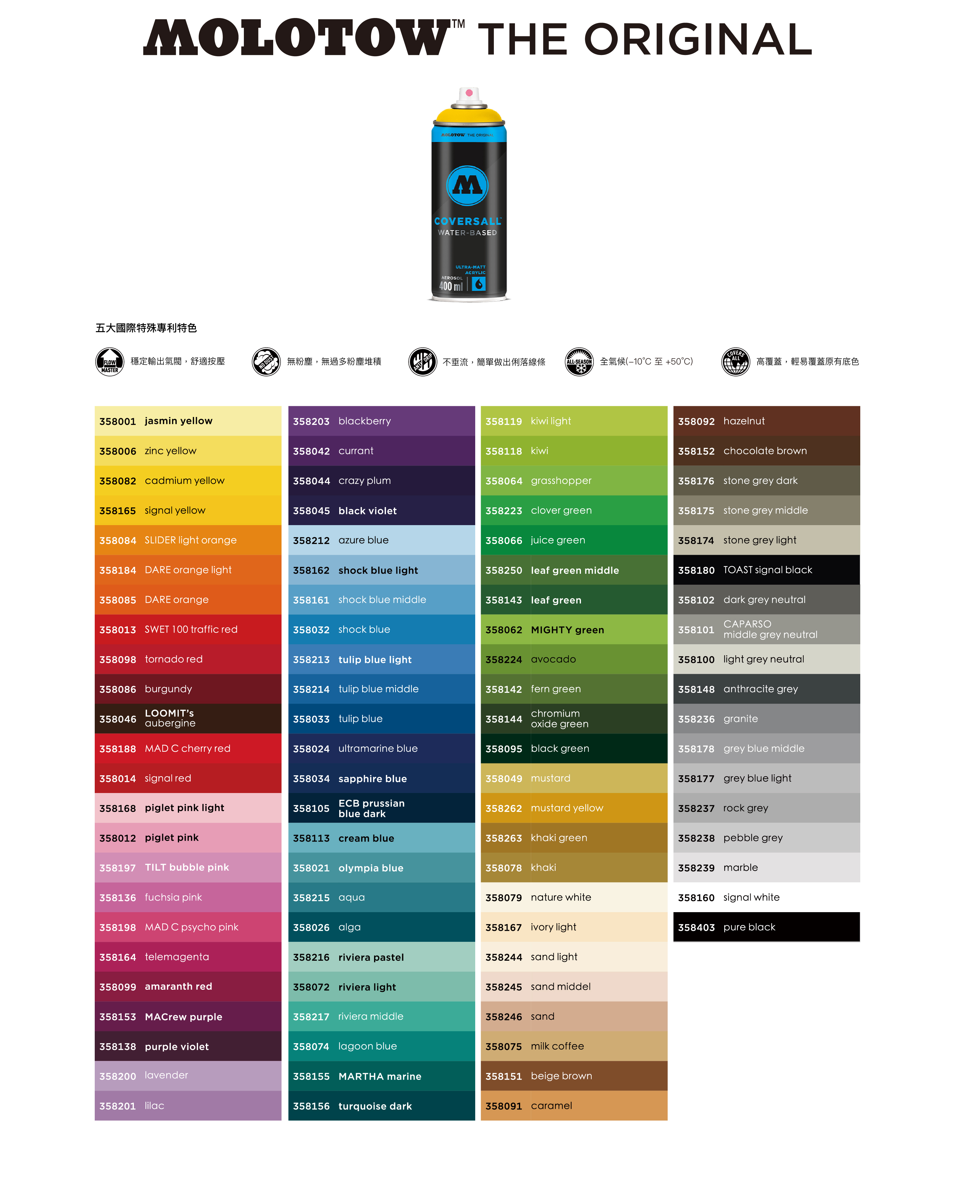 這款水性噴漆可以說是一種創新的改革,也是非常適合塗鴉的一款噴漆,除了高度覆蓋之外也有著超快乾的性能,甚至是噴塗時沒有任何氣味,可說是水性噴漆裡的一頭猛獸,這也是我們MOLOTOW™的特殊高性能技術.
