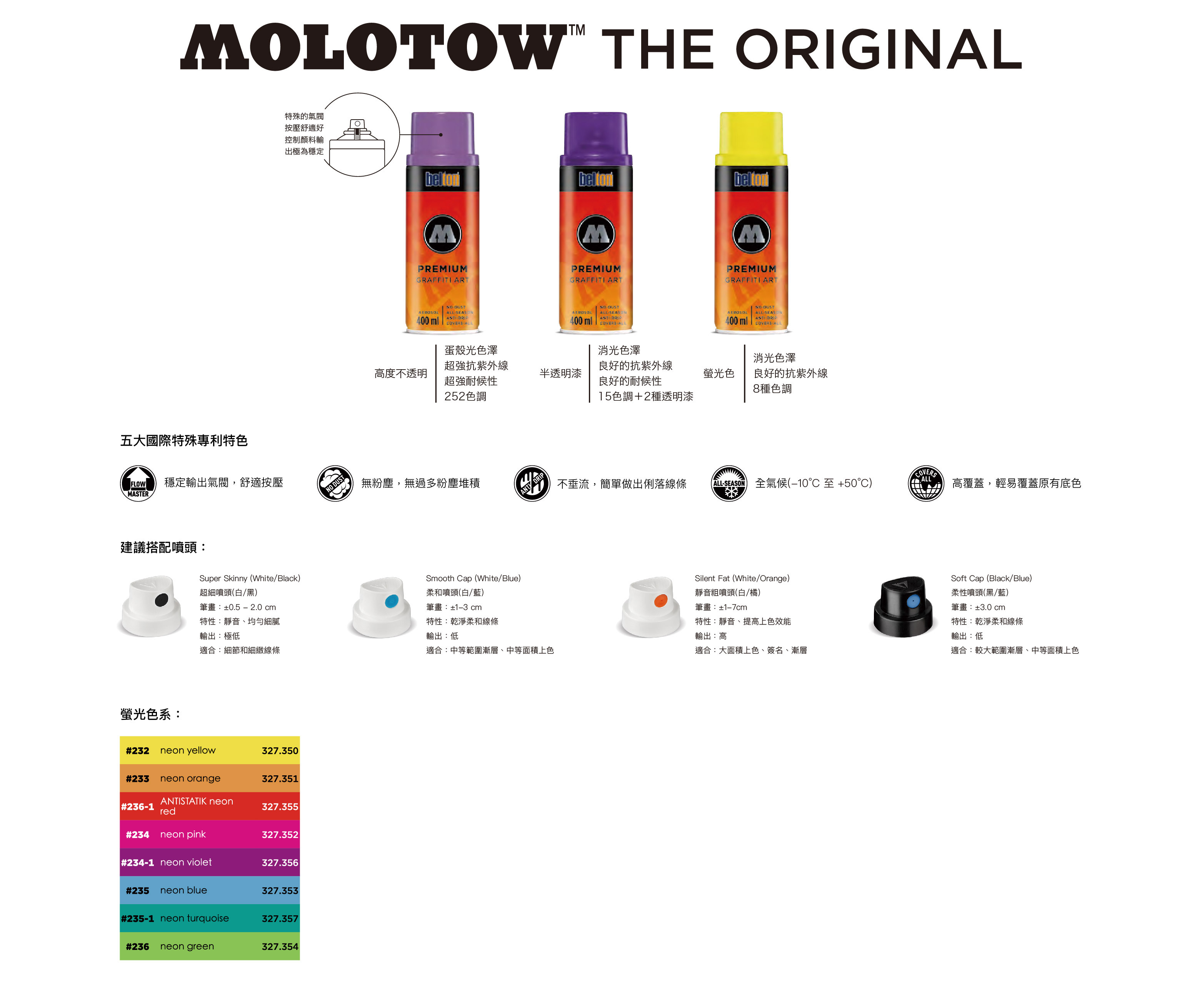 全世界第一款專為塗鴉設計的噴漆,也是藝術家一起為藝術家開發的一款噴漆.深受了全世界頂尖藝術家的喜愛與第一首選,這款高度不透明的噴漆使用了四倍研磨的Auto-K汽車烤漆顏料,是90年代以後最為指標性的塗鴉專用噴漆,MOLOTOW™ PREMIUM 擁有超過275種顏色,是世界上色彩最多最豐富的噴漆品牌.MOLOTOW™REMIUM 系列不止因為高度不透明和非常好的抗紫外線性能之外,在乾燥的速度上更是無人能比的,藝術創作需要長時間地保留外,較短的乾燥時間也能夠使藝術家能快速地完成作品.其除了275種絢麗的純色,沒有任何不足之處,另外還提供了螢光色與半透明色.