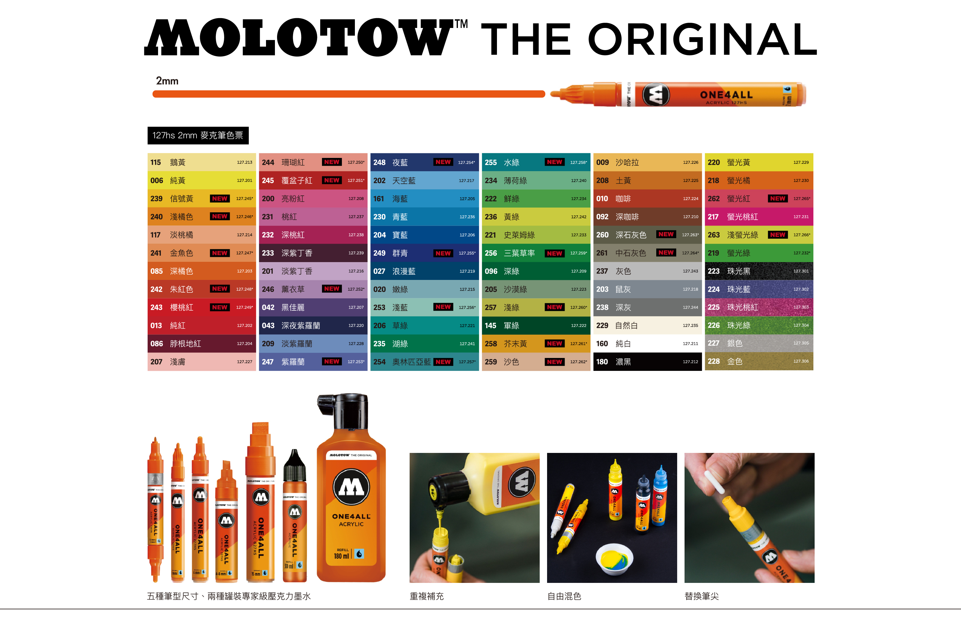 單頭2mm,可替換不同尺寸筆尖,高達74種色調(有兩色為黑白亮光色)