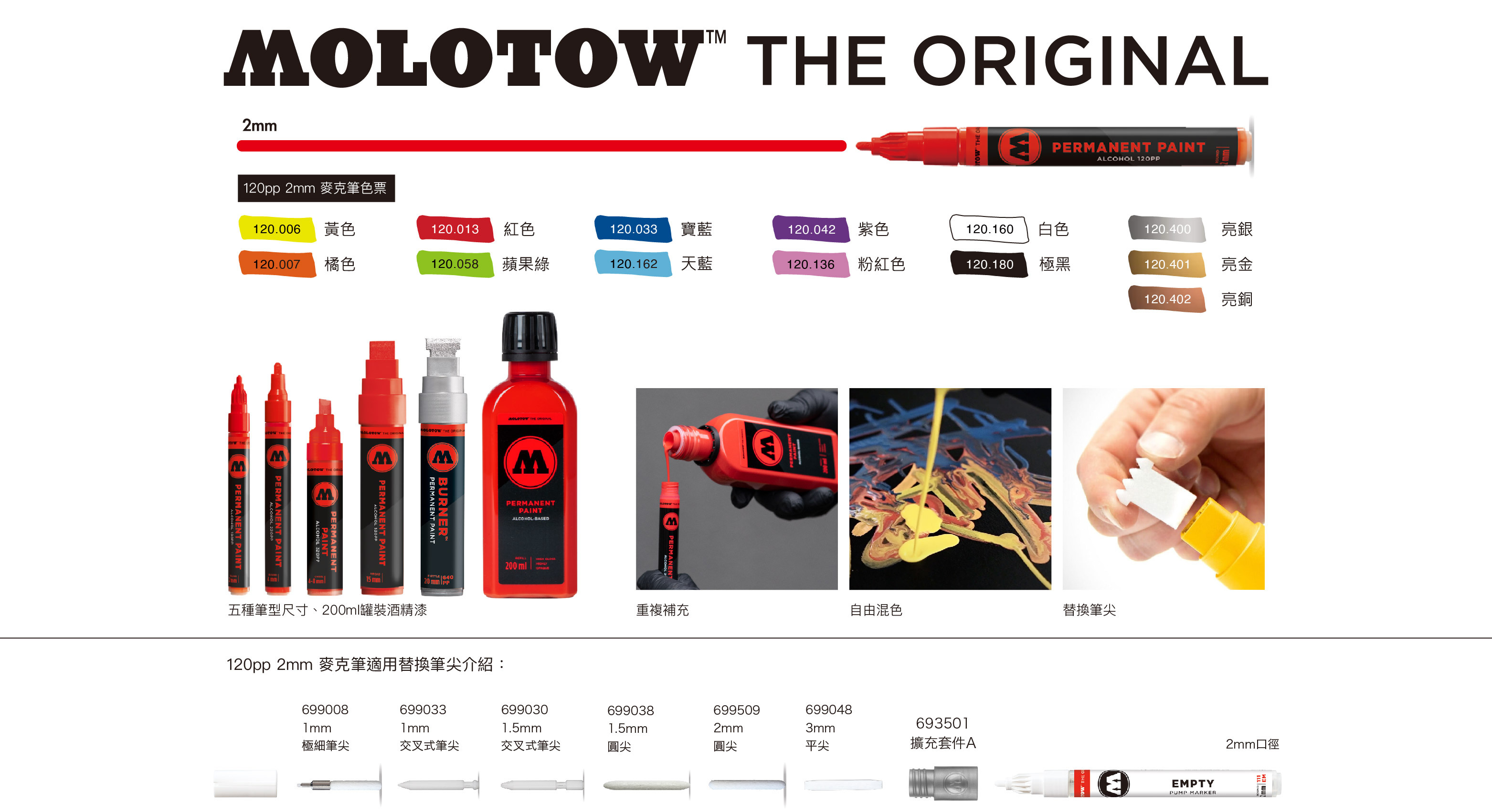 擁有五種賣筆尺寸、三種滴流筆尺寸可供選擇,永恆酒精漆麥克筆是可以重新補充、替換筆尖也能乾淨的完成創作,除此之外創作者也可以混合自己想要的顏色,總共有十三個顏色基底可供選擇。