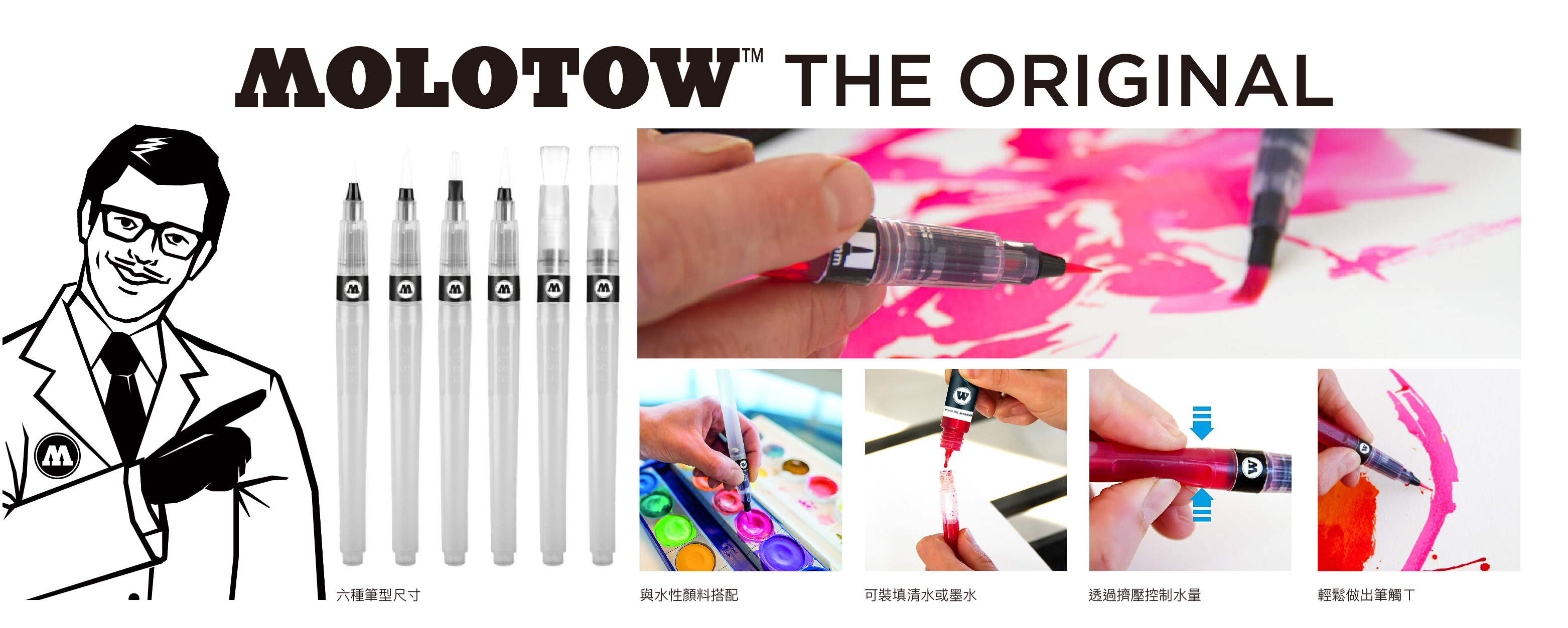 水筆對於水彩、上色或渲染是一種方便的繪畫工具,有著不同尺寸可供選擇,可擠壓的筆管適合裝填墨水、液態顏料或是水,可透過擠壓來控制墨水流量。